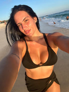 O top Cancún possuí bojo removível, alças grossas e fecho atrás. É uma opção confortável e prática para a moda praia.